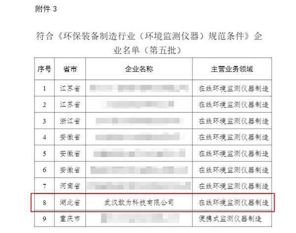 敢為科技入選符合《環保裝備制造行業(環境監測儀器)規范條件》企業名單(第五批),該名單全國入選企業僅九家,湖北省內僅此一家。