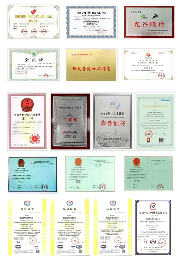 公司已通過ISO9001質量管理體系認證、“知識產權體系認證”、“環境管理體系認證”、“職業健康安全管理體系認證”,產品通過國家計量認證,連續四年入選東湖高新區“瞪羚企業”、連續兩次通過國家高新技術企業認定、兩次入選東湖高新區“3551光谷人才計劃”、入選湖北省“企業創新積分百強榜單”,曾獲得武漢市“科技小巨人”、“光谷高科技成長科技企業20強”、“武漢十佳創業第一名”、“創新型中小企業”、“專精特新”等榮譽。