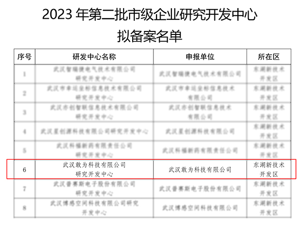經單位申報、區科技管理部門審核推薦、抽查復核、局長辦公會研究等嚴苛程序,《2023年第二批武漢市企業研究開發中心擬備案名單》于近日正式公布,敢為科技入選。