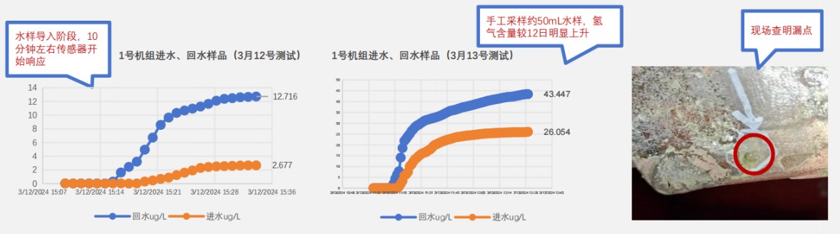設(shè)備投入運行后,通過實時在線監(jiān)測1號機(jī)定冷水含氫量,很快明確了漏氫現(xiàn)象,準(zhǔn)確地測量出氫氣泄露量,并參照《防止電力生產(chǎn)事故的二十五項重點要求》及時給出建議停機(jī)檢修的建議,成功地預(yù)警了滲漏缺陷及其進(jìn)一步影響。
