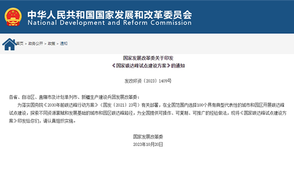 11月6日,國家發(fā)展改革委印發(fā)《國家碳達(dá)峰試點(diǎn)建設(shè)方案》的通知(發(fā)改環(huán)資〔2023〕1409號(hào)),在全國范圍內(nèi)選擇100個(gè)具有典型代表性的城市和園區(qū)開展碳達(dá)峰試點(diǎn)建設(shè),探索不同資源稟賦和發(fā)展基礎(chǔ)的城市和園區(qū)碳達(dá)峰路徑,為全國提供可操作、可復(fù)制、可推廣的經(jīng)驗(yàn)做法。